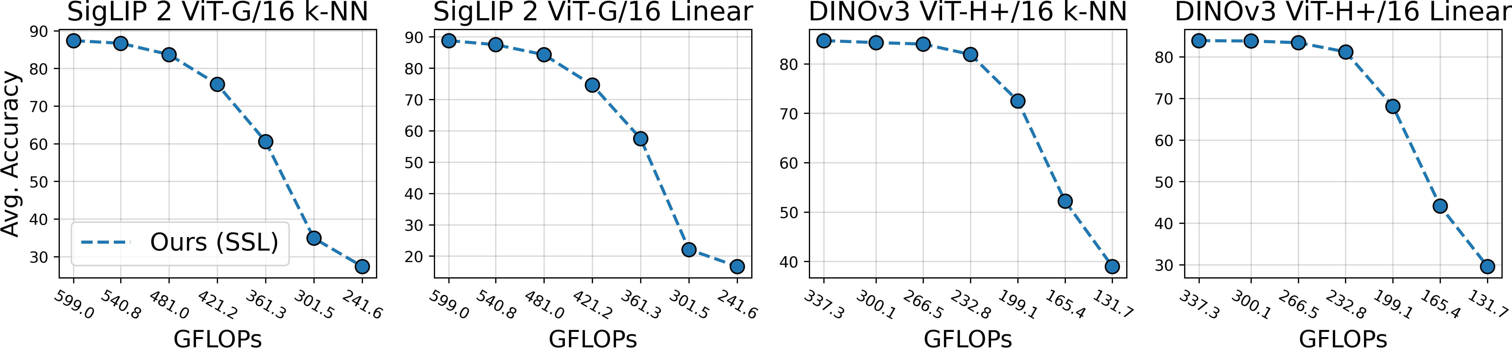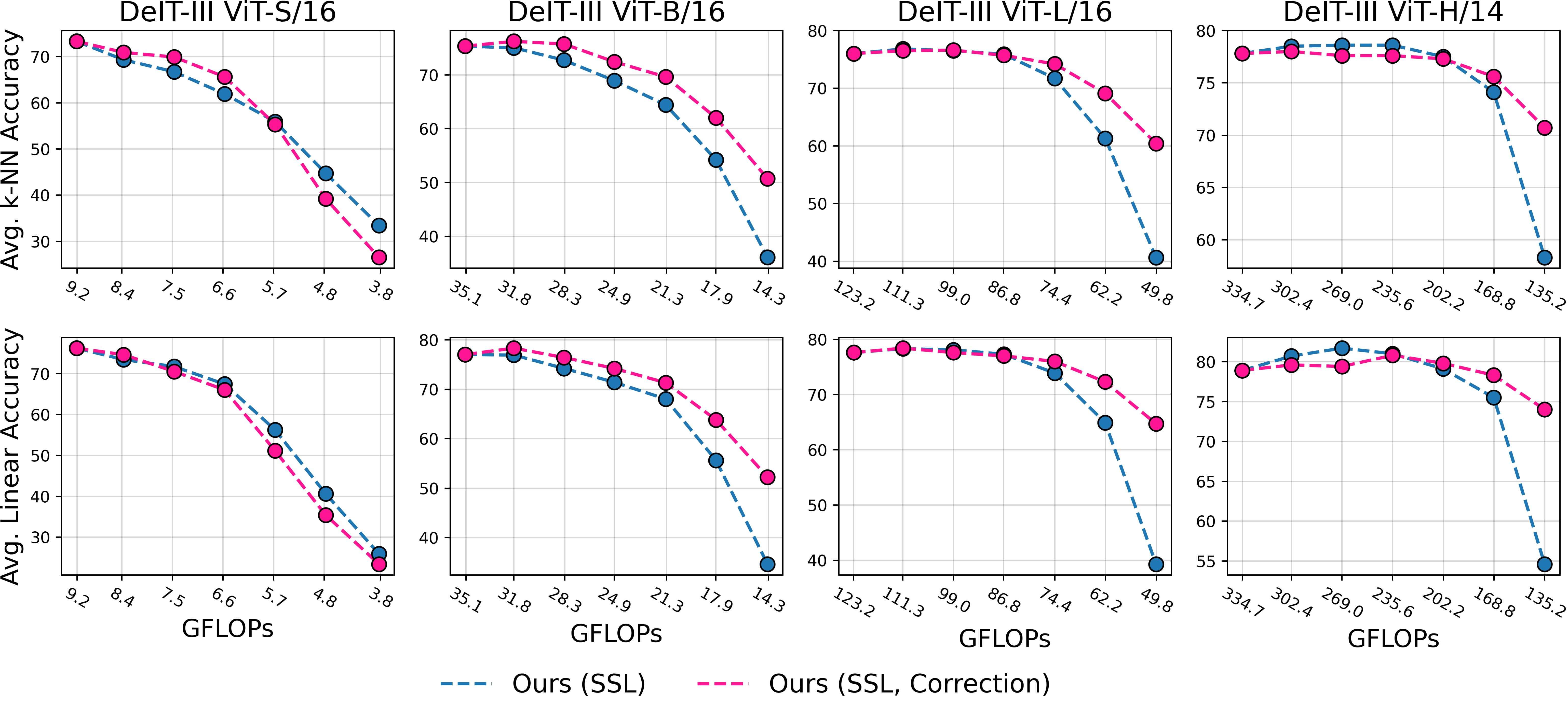 Figure 1: Overview of our method. We make pretrained models elastic in four steps: 1️⃣ we estimate the local inter-layer curvature via self-supervised gradients, 2️⃣ we model cross-network structure interactions via an evolutionary algorithm, 3️⃣ we fuse local and global scores in a unified importance measure, and 4️⃣ we rank structures once to derive subnetworks for any arbitrary sparsity.